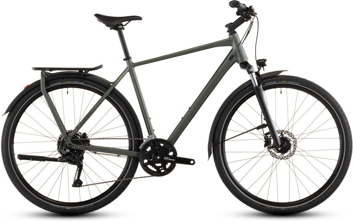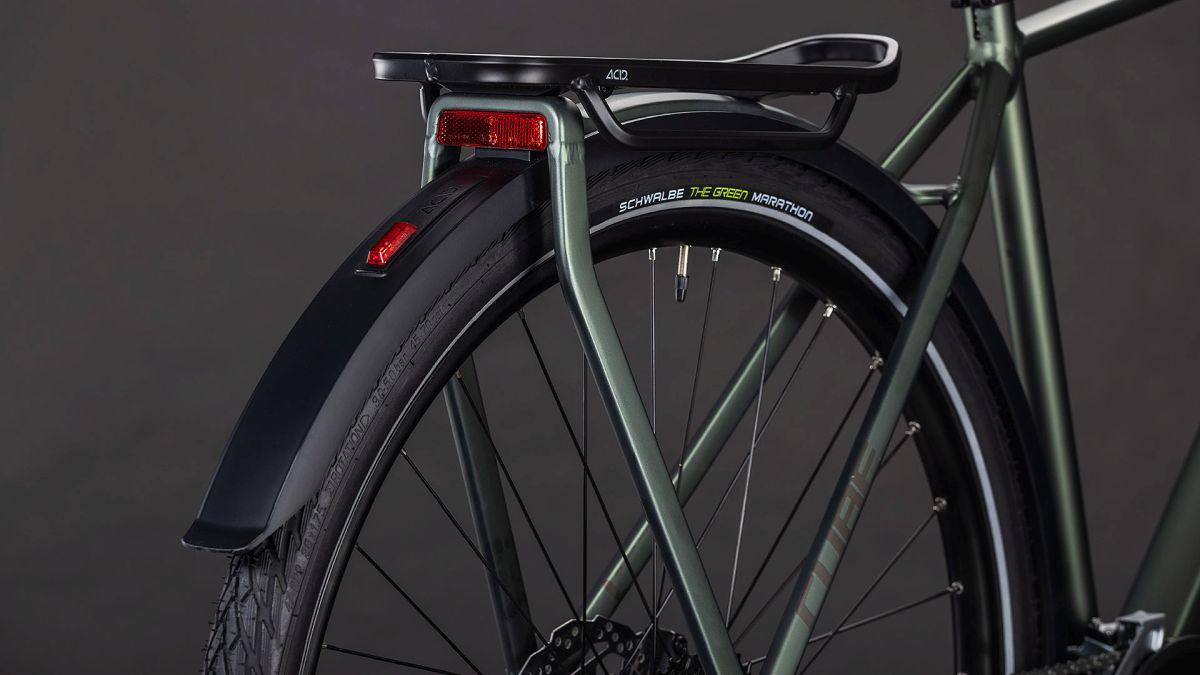 Aufsitzen, antreten und die Tour genießen: Mit dem schlichten Kathmandu ONE von CUBE bekommen Entdecker einen robusten und flexibel anpassbaren Alleskönner unter den Sattel. Auf dem stabilen, vielseitigen integrierten Gepäckträger IC 3.0 findet alles Platz, was unterwegs mit muss. ACID Schutzbleche, Vorder- und Rücklichter und ein Flat Mount Seitenständer sind auch mit dabei. Dazu hat die einfach bedienbare Cues 2x9-fach Schaltung aus dem Hause Shimano in jeder Situation den passenden Gang im Angebot. Ebenso von Shimano kommen die hydraulischen Scheibenbremsen für sicheres Verzögern und Anhalten bei jedem Wetter. Angenehmer Fahrkomfort, auch auf holprigen Wegen, ist das Spezialgebiet der Suntour Federgabel. Umweltbonus: Die spezielle Gummimischung der Green Marathon Reifen von Schwalbe besteht zum Großteil aus recycelten Altreifen – für nachhaltige Mobilität auf allen Wegen. Da kann's doch direkt losgehen, oder?