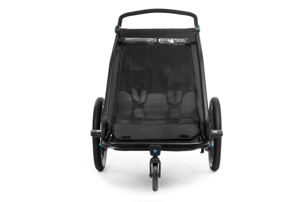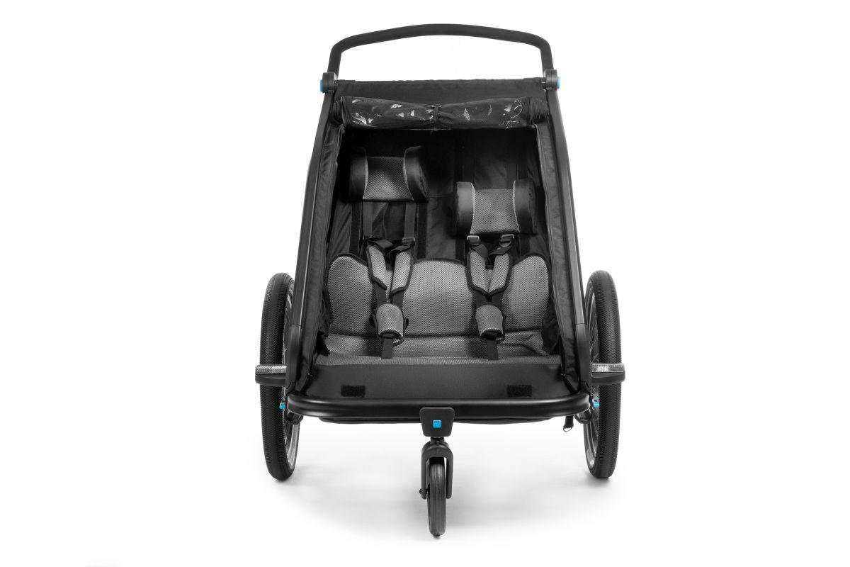 Der CUBE Kinder Fahrradanhänger Double CMPT ist der optimale Begleiter durch den Alltag. Das Multitalent besticht durch ausgeklügelte Funktionen als Fahrrad-Anhänger und Kinderwagen. Der große Insektenschutz an der Front und den Seiten hält ungewollte Fahrgäste vor dem Eindringen ab, ohne dabei die Frischluftzirkulation zu beeinflussen. Dank Sonnenschutz werden die kleinen Fahrgäste nicht bei ihren Nickerchen geblendet. Der Spritzschutz hält die Kids auch bei matschigen Fahrten trocken. Die Sitz- und Rückenpolster sowie Kopfpolster mit Helmpocket, machen die Fahrt für die Kleinen zum komfortablen Vergnügen. Die Federung ist individuell einstellbar, je nach Untergrund und Gewicht. Mit dem zusätzlich erhältlichen Jogger Kit lassen sich alle Ausflüge noch flexibler gestalten.