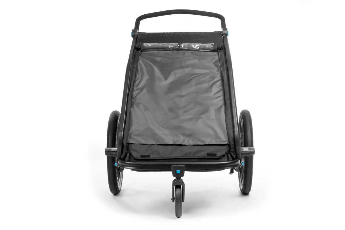 einfache Handhabung, Sitz- und Rückenpolster, verstellbare Kopfpolster mit Helmpocket, Heckfenster, Sonnen-, Fliegen- und Spritzwasserschutz, höhenverstellbarer, ergonomischer Griff, seitliche Belüftung, 70 Liter Kofferraum, verstellbare Federung, Quick-Release Räder, farblich abgesetzte Funktionsteile, reflektierende Elemente, inkl. Deichsel, Fahne, Buggyrad, Rücklicht mit Batterien, Max. Zuladung 42 kg, Stützlast: 1 - 8 kg