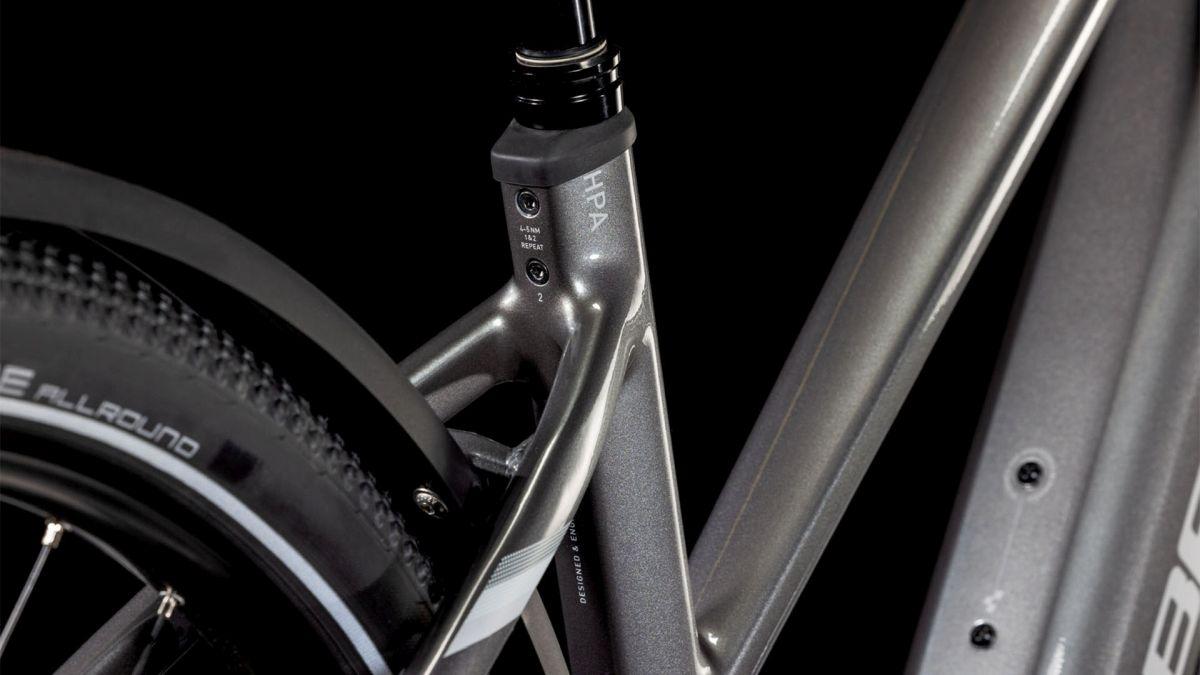 Auf den ersten Blick sieht der Nuride Hybrid Trapezrahmen vielleicht unspektakulär aus, doch wer genau schaut, wird von seiner subtilen Eleganz und seinen innovativen Details begeistert sein. Neben einer Federgabel mit 100 mm Federweg für ein Plus an Fahrkomfort und Kontrolle haben wir das Chassis mit großzügiger Reifenfreiheit (sogar inklusive der mitgelieferten Schutzbleche) ausgestattet. Im Inneren verlaufende Züge unterstreichen die cleane Optik des Rahmens und verursachen kaum Wartungsaufwand. Ebenso harmonisch ins Design integriert sind der Bosch CX Antrieb und der 800 Wh starke PowerTube Akku. Außerdem gibt's einen Kettenschutz sowie ein UDH für einfachere Ersatzteilverfügbarkeit. Was noch? Serienmäßig verbaute Schutzbleche, Lichter und ein Seitenständer. Da kann das nächste Touren-Abenteuer kommen!