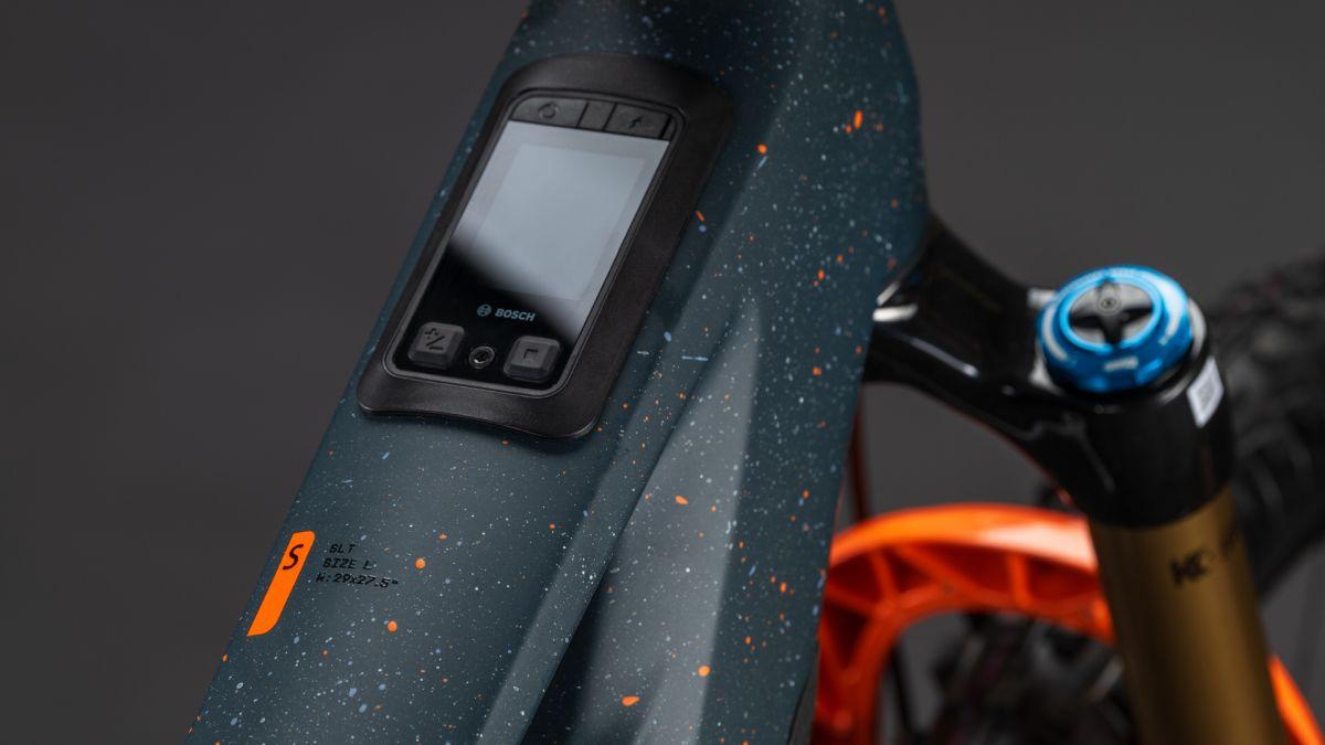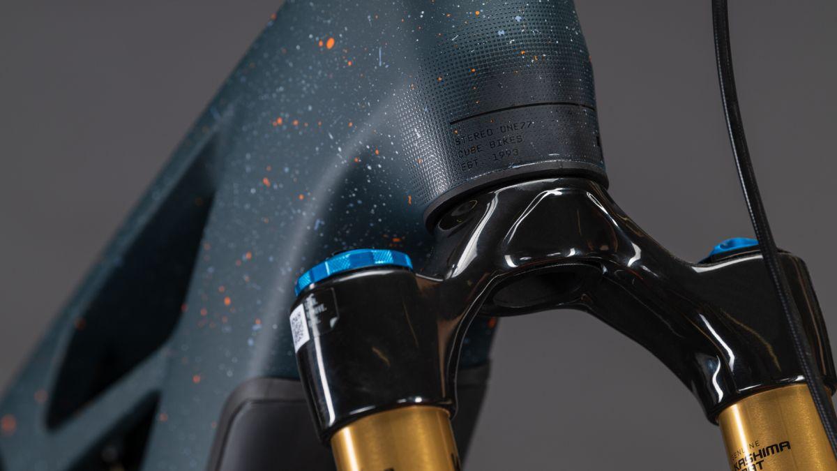 Der Rahmen des Stereo Hybrid ONE77 HPC ist wahrlich eine Klasse für sich, denn hier treffen 170 mm Federweg an der Front und am Heck auf ein Mullet-Set-up mit einem 29 Zoll Vorderrad und 27.5 Zoll Hinterrad. Damit werden Big-Mountain-Trail-Träume wahr! Wie immer bei CUBE maximal detailverliebt konstruiert auch der Rest: Integrated Cable Routing sorgt für einen supercleanen Look. Dazu kommt ein Steuersatz zur Winkelverstellung, mit dem sich das Handling an individuelle Vorlieben und Anforderungen anpassen lässt. Außerdem haben wir den 800 Wh starken PowerTube Akku gleich über dem Bosch CX-R Motor sauber und formschön ins Carbon-Unterrohr integriert. Für einfachere Ersatzteilverfügbarkeit gibt's ein UDH am Aluminium-Hinterbau – und weil wir auch eine Direct Mount Kettenführung verbaut haben, geht's mit diesem Fully selbst bei schwierigen Bedingungen weiter, weiter und immer weiter.