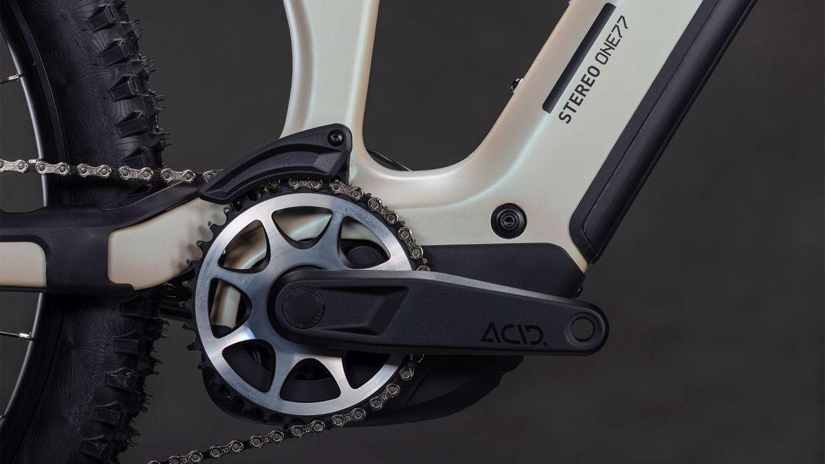 Der Rahmen des Stereo Hybrid ONE77 HPC ist wahrlich eine Klasse für sich, denn hier treffen 170 mm Federweg an der Front und am Heck auf ein Mullet-Set-up mit einem 29 Zoll Vorderrad und 27.5 Zoll Hinterrad. Damit werden Big-Mountain-Trail-Träume wahr! Wie immer bei CUBE maximal detailverliebt konstruiert auch der Rest: Integrated Cable Routing sorgt für einen supercleanen Look. Dazu kommt ein Steuersatz zur Winkelverstellung, mit dem sich das Handling an individuelle Vorlieben und Anforderungen anpassen lässt. Außerdem haben wir den 800 Wh starken PowerTube Akku gleich über dem Bosch CX Motor sauber und formschön ins Carbon-Unterrohr integriert. Für einfachere Ersatzteilverfügbarkeit gibt's ein UDH am Aluminium-Hinterbau – und weil wir auch eine Direct Mount Kettenführung verbaut haben, geht's mit diesem Fully selbst bei schwierigen Bedingungen weiter, weiter und immer weiter.
