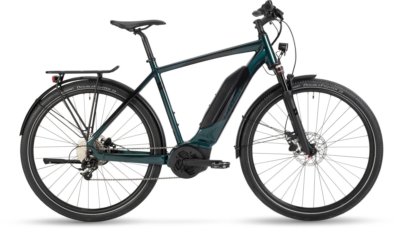Für den Einstieg ins sportlich-aktive Radtourenglück bietet das E-4X Tour erstklassige Voraussetzungen: Als Abkömmling von STEVENS’ X-Crossern bringt es schlanke 23,6 kg Gesamtgewicht auf die Waage – ohne jeglichen Verzicht auf Robustheit, Zuverlässigkeit und Funktionalität. Der Elektro-Schub des geschmeidigen Bosch Active Line Plus-Antriebs reicht dank 500Wh-Akku auch für lange Etappen. Hydraulische Scheibenbremsen (180/180 mm!), die 9fach-Schaltung mit weiter Übersetzungsspanne und Allround-Reifen von Continental sind den schönsten (Berg-)Strecken locker gewachsen. Und für Komfort ist dank der sensiblen Federgabel ebenso gesorgt wie für genügend Ladekapazität.